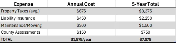 Insurance costs rise: Many vacant land liability policies run a few hundred dollars per year (often in the $300–600/year range depending on parcel size and risk).